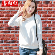 2017春季新款女装韩版时尚休闲宽松蕾丝拼接纯色长袖T恤女上衣潮