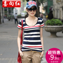喜向红2017夏装新款女装紧身显瘦圆领条纹T恤女短袖体恤修身韩版