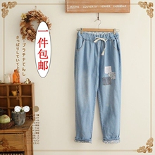 2016夏季新款日系森女装小清新贴布抽绳松紧腰直筒牛仔裤长裤女Q4