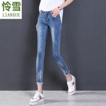 怜雪2017春秋装新款牛仔裤卷边学生破洞小脚裤修身显瘦铅笔裤 女