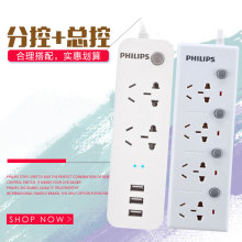 飞利浦插座插板4位独立开关排插智能USB插排套餐接线板拖线板包邮
