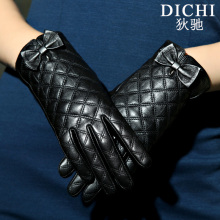 狄驰 秋冬季皮手套女士山羊皮手套菱形格蝴蝶结保暖触屏真皮手套