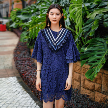原创裙子女夏中长款连衣裙藏青蕾丝裙2017女新款五分袖夏季圆领裙