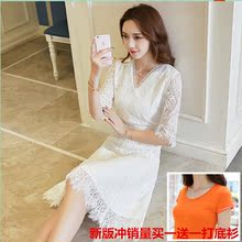 春装2017女装韩版V领中长款蕾丝连衣裙女春秋中袖衣服气质a字裙子