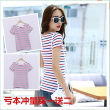 T恤夏季女装新款韩版一字领露肩短袖条纹花体恤学生打底衫上衣女