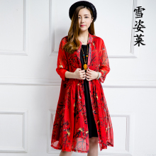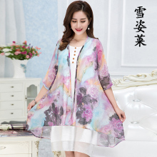 夏季新款女装长袖沙滩防晒衣大码中长款雪纺开衫印花两件套连衣裙