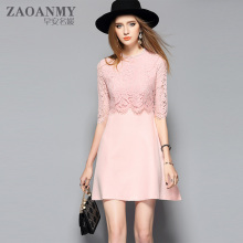 2017春装新款名媛立领中袖蕾丝拼接波点雪纺连衣裙夏季宽松蛋糕裙