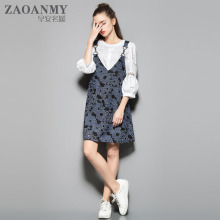 欧洲站2017春夏新款时尚镂空白衬衫+牛仔背带裙女夏套装裙两件套