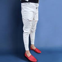 2017夏季快手网络红人同款精神社会小伙修身束脚破洞牛仔裤男9分