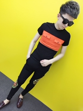 2017春新款快手网络红人同款男精神社会小伙修身口袋彩色拼接T恤