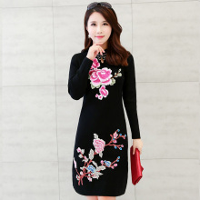 2016年秋装新品刺绣针织衫中国风旗袍中长款打底毛衣女套头连衣裙