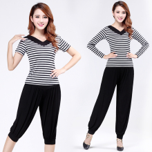 广场舞服装新款套装2017夏中老年成人舞蹈服条纹短袖上衣灯笼裤女