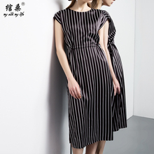 绾桑 2017春装新欧洲站优雅竖条纹短袖腰带 重磅真丝连衣裙 长裙