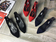 真皮女单鞋子细跟高跟尖头铆钉绑带女鞋子