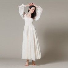 涂月高腰修身灯笼袖仙女雪纺连衣裙 波西米亚白色大摆长裙女夏
