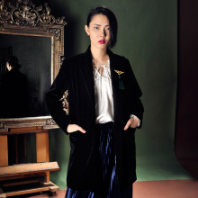 涂月原创定制复古加厚黑色丝绒西装女中长款春秋修身中性直筒外套