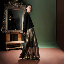 涂月原创欧美气质半身裙 中腰烫金雪纺长裙修身简约金属感百褶裙