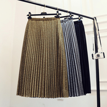 2017春新款韩版裙子女百搭时尚金丝银色亮闪闪中长款百褶裙半身裙