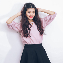 2017夏季新款韩版宽松棉麻灯笼袖衬衫女半袖学生圆领衬衣百搭中袖