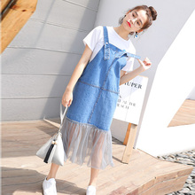 2017夏季新款韩版潮牛仔背带裙女中长款拼接网纱学生连衣裙子宽松