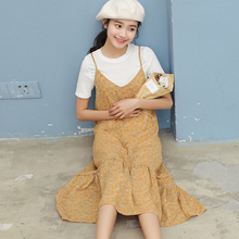2017夏季新款韩版雪纺吊带裙女收腰中长款碎花连衣裙女A字裙学生