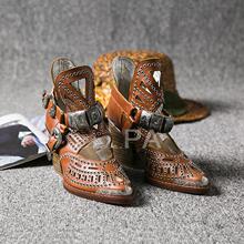 意大利制2017春夏新款欧货彩色牛皮手工钉珠绣花鱼嘴坡跟鞋短靴女
