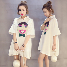 纤姿黛梦衬衫领中长款印花宽松显瘦短袖连衣裙子