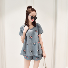 夏季新款2017新款韩版蝴蝶结短袖牛仔上衣短裤两件套潮 女