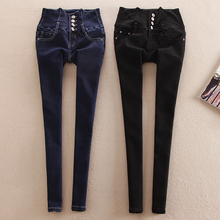 2016春装新款 百搭修身显瘦水洗黑色蓝色单排扣高腰小脚牛仔裤女