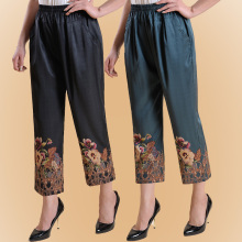 新款夏季妈妈装裤子时尚中年人女手绘直通松紧腰裤老年绸缎九分裤