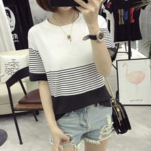 T恤女短袖大码 夏季学生印花棉上衣潮韩版宽松显瘦黑白条纹打底衫