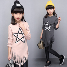 2017春装新款女童长袖T恤 中长款流苏打底衫儿童女大童纯棉上衣潮