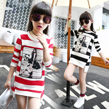 女童长袖t恤春秋2017新款韩版中长款条纹纯棉上衣中大儿童打底衫