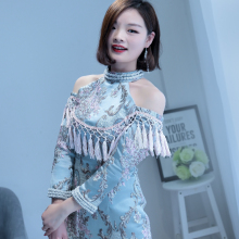 犀犀家刺绣连衣裙挂脖露肩流苏钉珠旗袍宴会小礼服裙名媛气质女装
