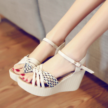 韩版坡跟凉鞋女夏2017新款鱼嘴蕾丝百搭性感松糕厚底防水台高跟鞋