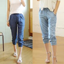 春夏季7分裤女天丝牛仔裤宽松阔腿裤哈伦七分裤松紧腰女裤子中裤