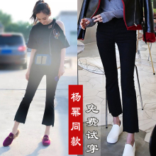 杨幂同款黑色喇叭裤女九分牛仔裤弹力高腰显瘦微喇毛边裤明星款