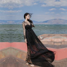 春装新款网纱透视名媛性感镂空V领长袖女神海边度假连衣裙夏长裙
