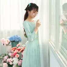 魅色 碧色烟萝2017春装新款复古学院风欧根纱绣花连衣裙中长款
