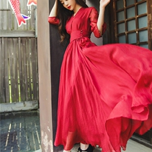 魅色 天空之蓝2016秋装新款文艺棉麻英伦高腰连衣裙森女度假长裙