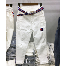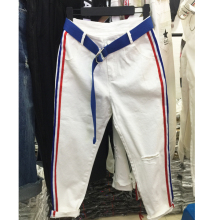 欧洲站春潮款配蓝色腰带破洞白色牛仔垮裤女九分显瘦哈伦裤侧织带