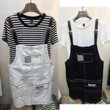 欧洲站春夏黑白色牛仔背带裙立体大口袋英文字母休闲两件套背带裙