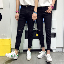 夏季弹力紧身破洞九分裤男女修身小脚牛仔裤潮青少年韩版9分裤子