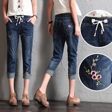 大码松紧腰牛仔裤女休闲宽松弹力夏季梅花刺绣七分牛仔裤女哈伦裤