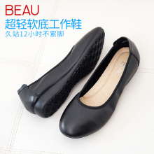 BEAU真皮工作鞋女黑色浅口单鞋女平底鞋圆头妈妈鞋大码女士小皮鞋