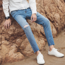 韩版潮男修身九分毛边牛仔小脚裤男破洞浅色青少年9分铅笔乞丐裤