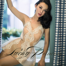 法国新款女性感镂空透明蕾丝连体衣欧美背心式美背深V领透视睡衣