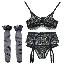 黑色nb深v镂空性感诱惑聚拢bra超薄无垫露乳内衣裤吊袜带文胸套装