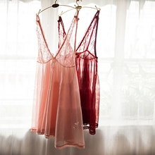 欧美性感女士深V仿真丝诱惑蕾丝露背吊带丝绸睡裙内衣睡衣家居服