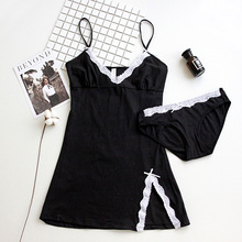 包邮睡衣女春秋经典黑色小开叉性感棉质睡裙+三角裤套装家居服
